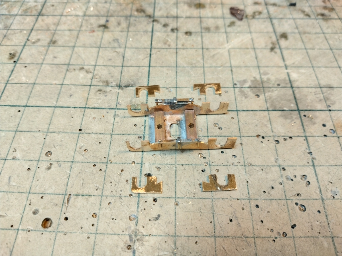 軸受は台車枠にハンダ付けしてから仕上げヤスリで微調整を繰り返し、台車枠の外側のバリ?もキレイに磨いて漸く回りました。ところが車軸の押さえ板に取付けたスペーサーの厚さが足らず、台車枠の中に押え板をネジ止めするプレートを新たに追加する事になりました。手前が取付板で1,5厚です。