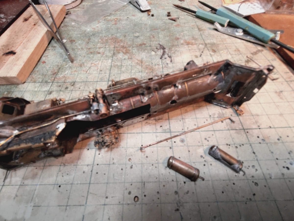 ハンダ鏝を当ててバラしました! なるほど〜内側に来る欠き取りをランボードにベタ付けしてあったんですね! こりゃエアータンクは使えそうだ〜(^^ゞ。ジャンク品に付いていたエアータンクは7ミリ径のようで活かせるなら活かしたい!(^^) 給水管はいったん外し、ランボードと給水管の間に給水ポンプからの排気管を追加します。