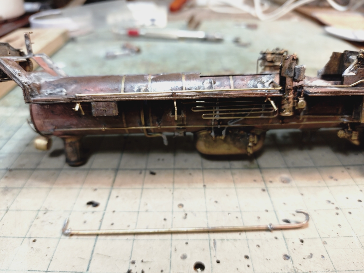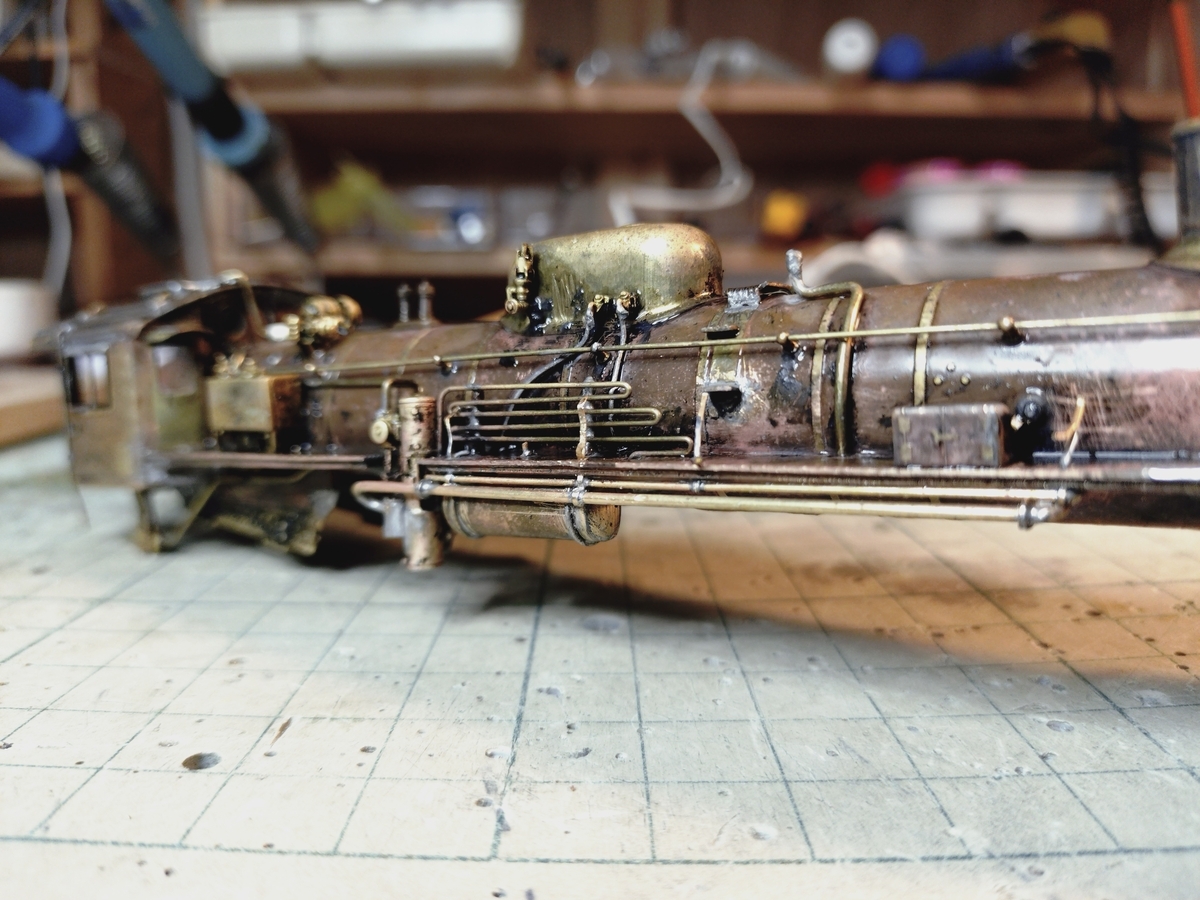 C55型はスペックとしてはC57に大きく劣る形式なのですが、日本の蒸気機関車生産が順調であった時代の作りの良さから、C57に伍して活躍しました。そんなC55ですから、あまりゴチャゴチャしたディテールは取り付けず、運転本位のスカッとした姿にまとめたいと思います。(^^)。 これからも余分なハンダの除去には苦労しそうですが、今日のところはランボード下のパイピングが当たり前に終わったので良かった良かった!(^^)