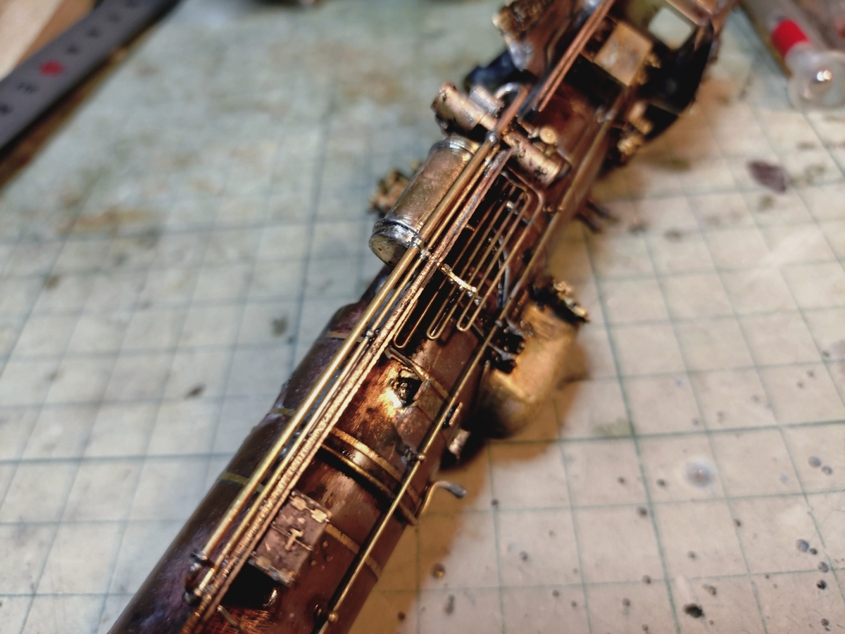 ランボードしたに2列並んだ配管が蒸気機関車らしい!と自画自賛、(^^ゞ 電気配管はシリンダの外側をフロントデッキに降りていくのですが、カッチリと配管出来そうも無いのでシリンダの後ろで内側に曲げてしまうインチキですが、まぁ無いよりはマシと思います。(^^ゞ