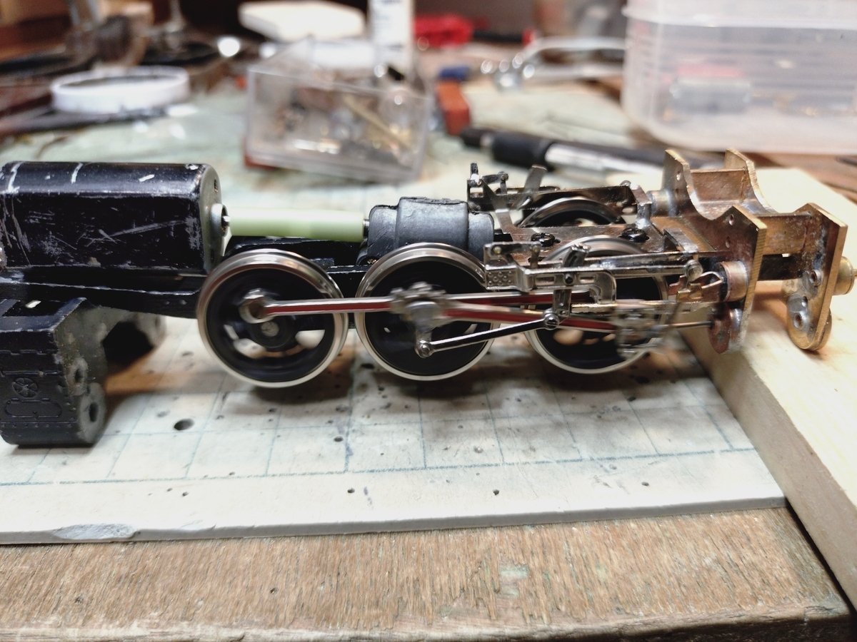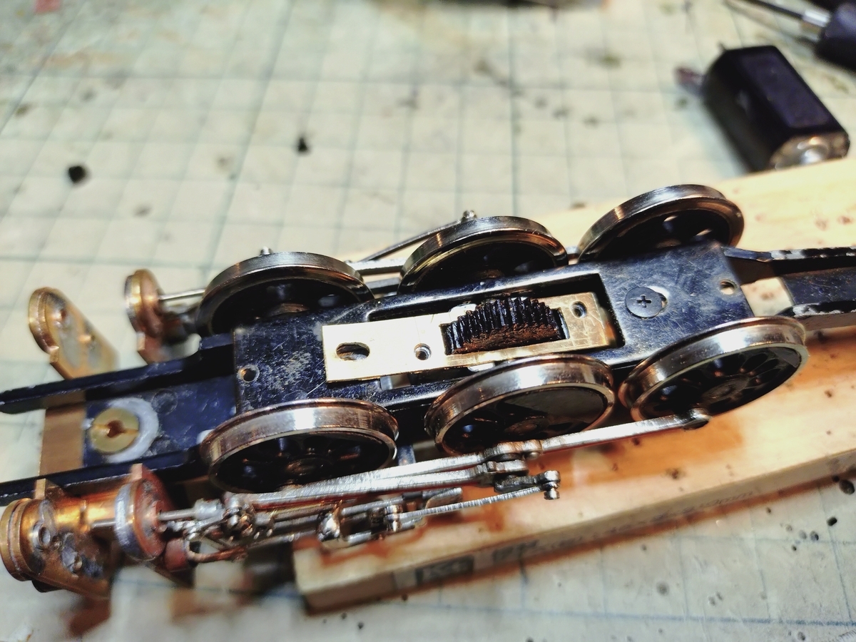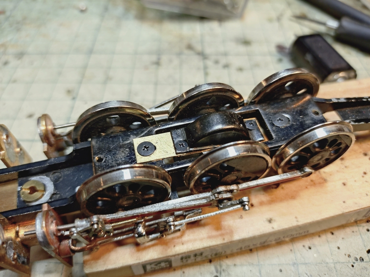 昨晩のベンチテストで車輪が上下に踊ってシャクったのと、テーブル上での手押し遊びでは好調な事から動輪の上下動を殺せば何とかなるか?と考えました。動輪の車軸部分に02厚2ミリ幅の帯金をハンダ付けして車軸の暴れを押さえる算段です。(^^ゞ