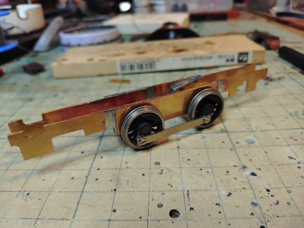 主台枠に前後のフレームをハンダ付けしてから両側のフレームをピッタンコ合わせて軸穴をヤスリで仕上げました。