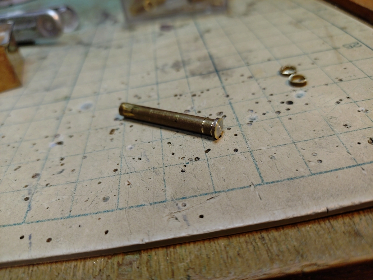 昨夜に引き続きパイプの輪切りから始めました。今夜は飛ばす事2回!(T_T) 這いずっても見つからず、昨晩飛ばしたサイズ違いが見つかる始末!(^^ゞ 今夜は5ミリ径で4ミリ丸棒に嵌め込む算段です。