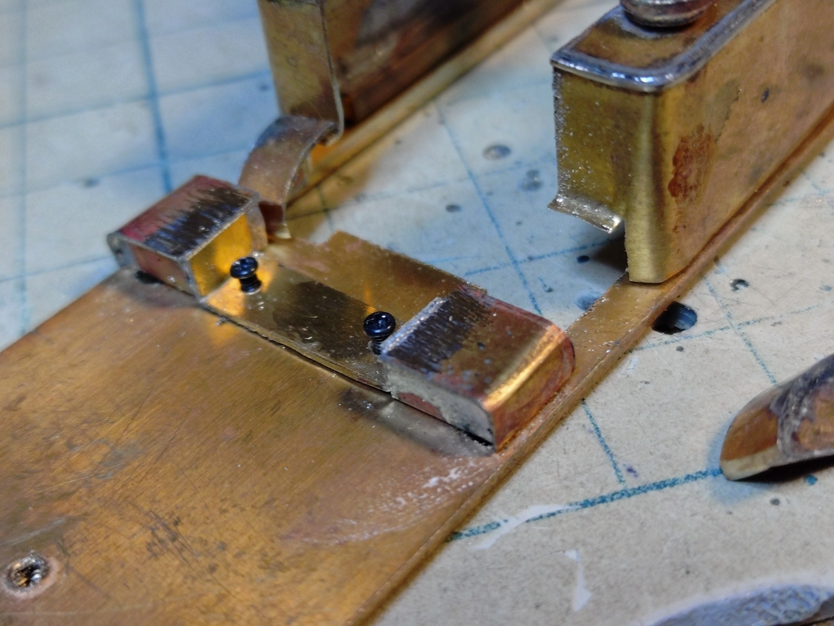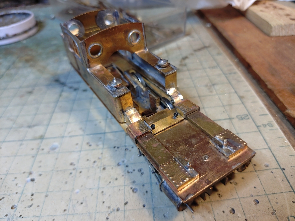 ところが車体は動輪に当たって被さりません。サイドタンク先端を曲げしろもろとも糸鋸でカットしました。 03厚ですから糸鋸刃は5・0番を使いサイドタンクがペコペコ歪まないように保持には気を使いました。