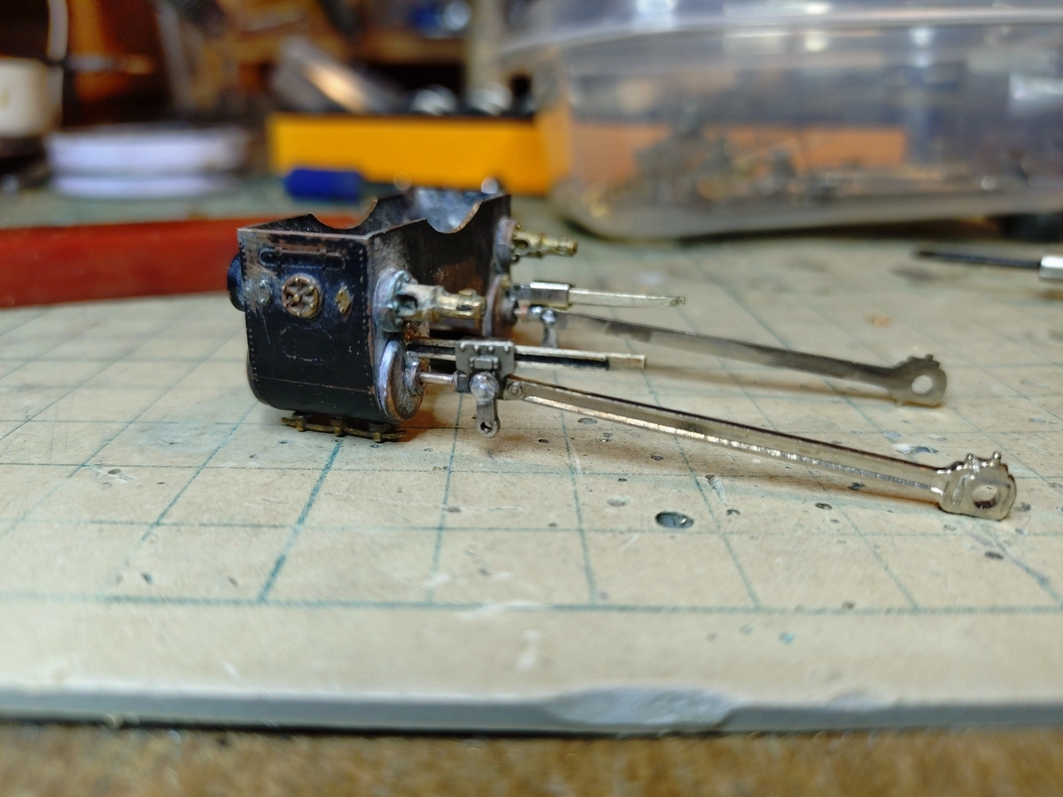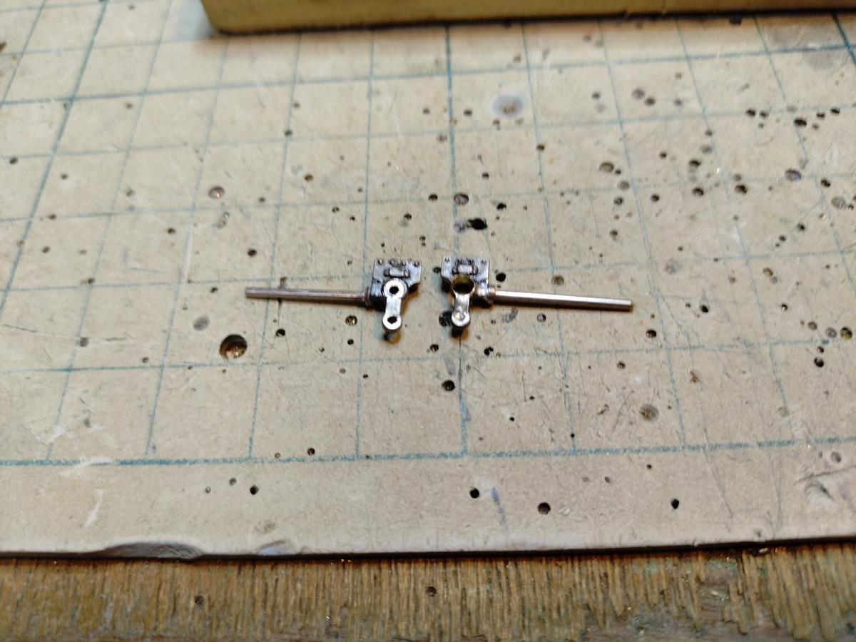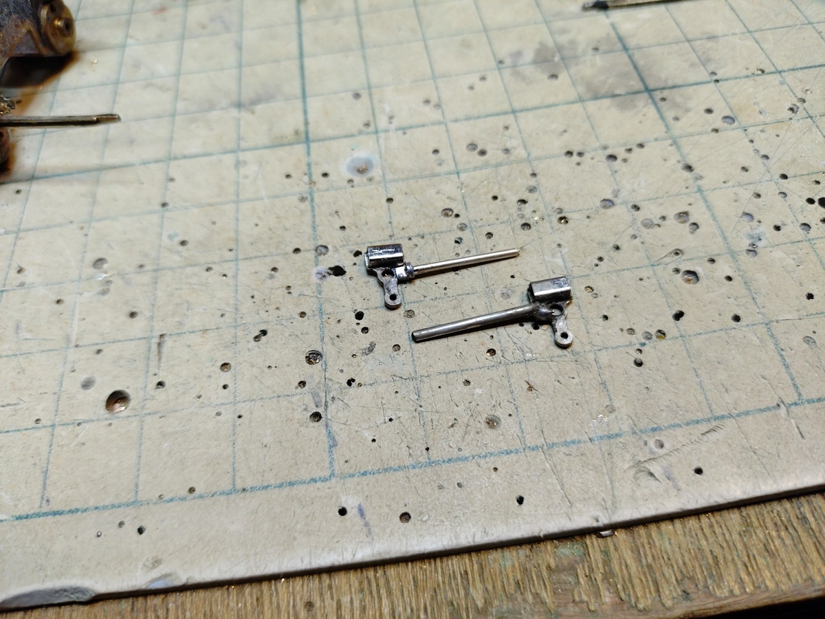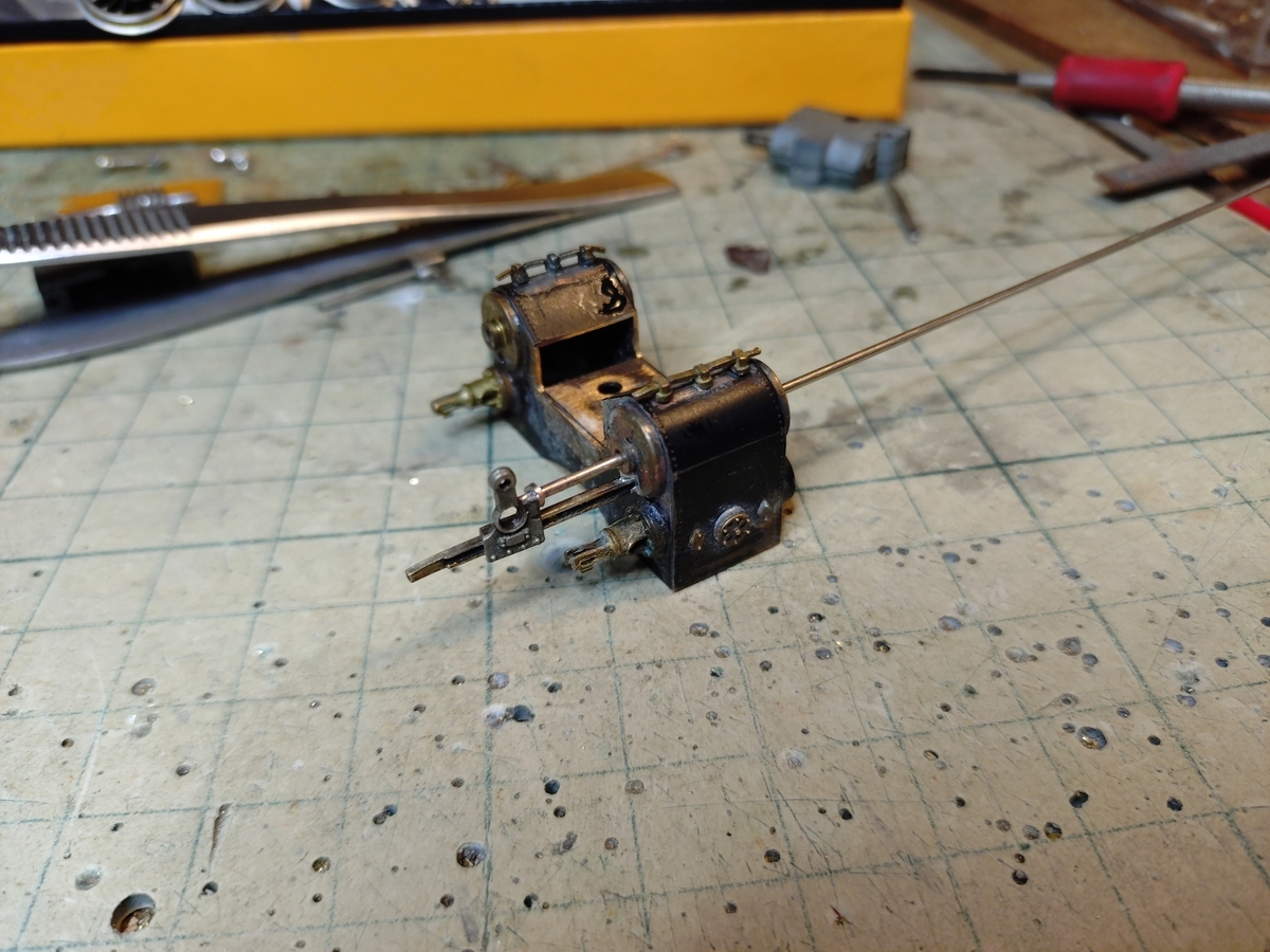 天賞堂9600型からのクロスヘッドはピストン棒がもげてしまいましたので、1ミリ洋銀線に2ミリパイプを輪切りにしたカラーを通しクロスヘッド取付部は少し潰して接触面を増やしてハンダ付けしました。カラーにもハンダが回りますからガッチリ付きます。