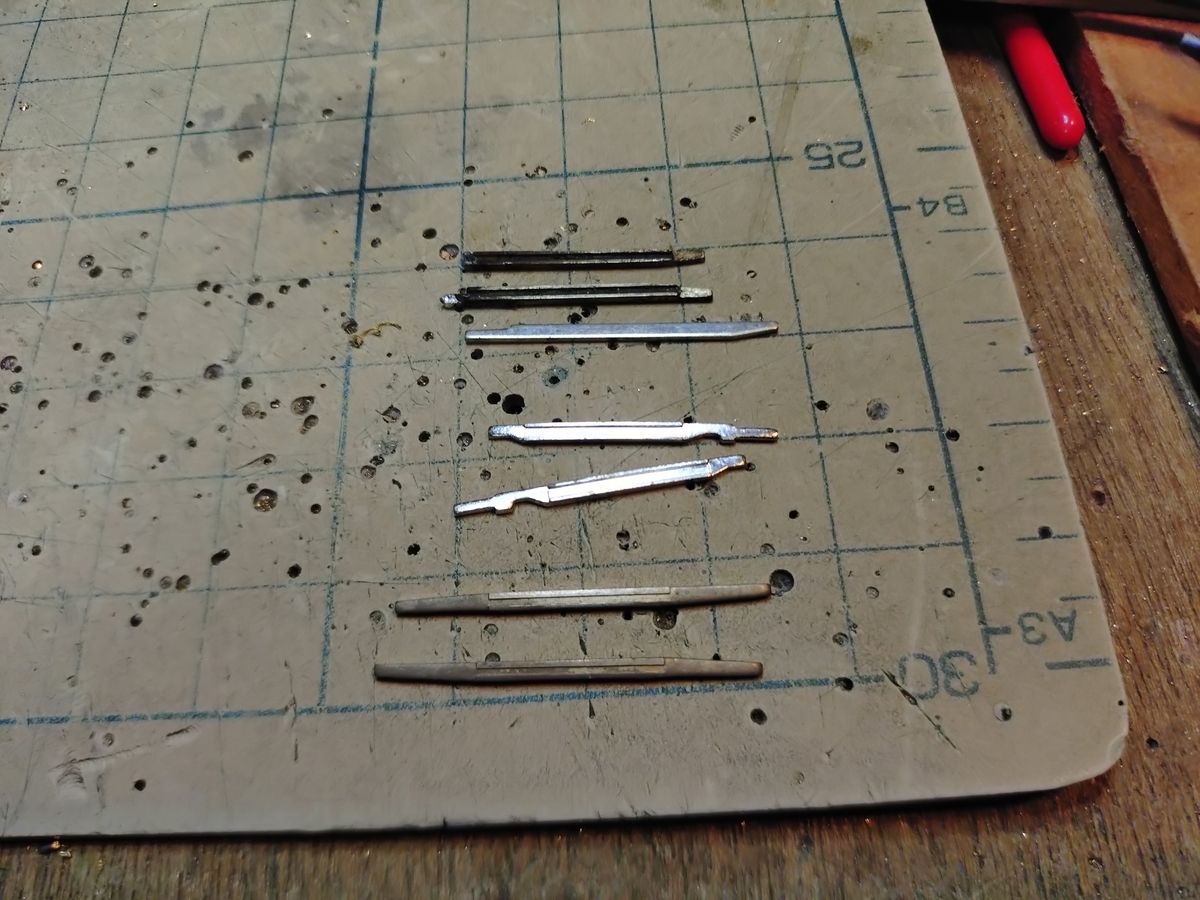 さて今夜はシリンダーに付いていなかったスライドバーの用意から。家探しして出て来たスライドバーのうち、出どころ不明の最上段の2本を加工してシリンダー後蓋にハンダ付けしました。 シリンダー後蓋にスライドバー穴が開いていたので、クロスヘッドのメインロッド先端とピストン棒を一致させる調整は、スライドバーの後蓋への差し込み部分の上下を削る際に位置出しをしています。